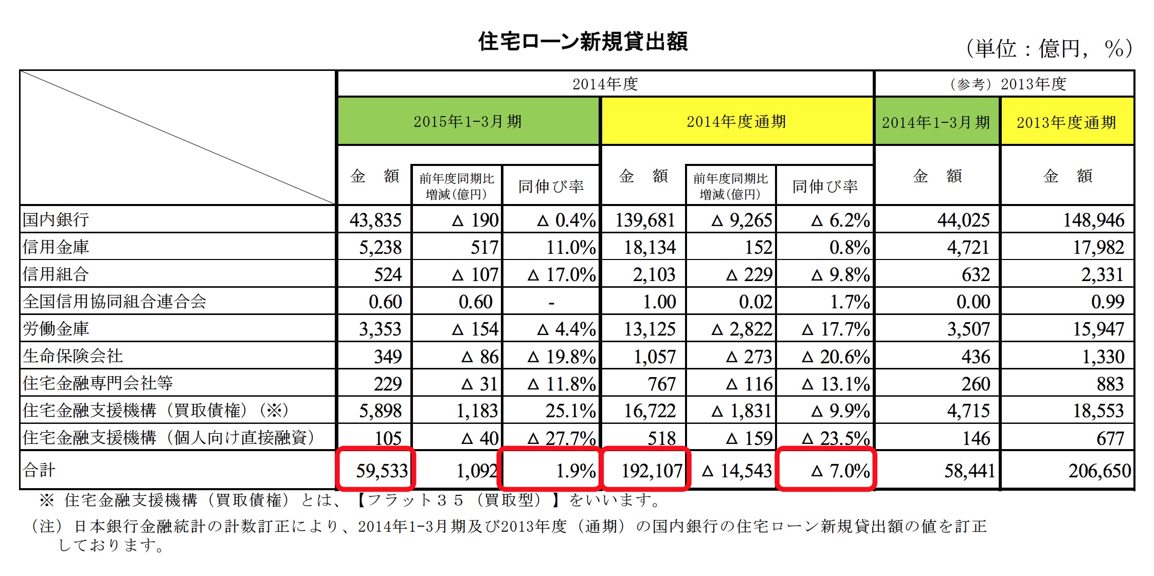 それによると15年1-3月期は5兆9533億円で、対前年度同期比1.9%の増加。 2014年度通期でみると、住宅ローン新規貸出額は19兆2107億円で、同7.0%減となった。詳細はコチラ。