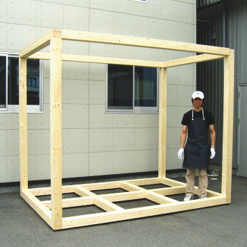 プレカット加工による土台・柱・梁などをパッケージ化しており、仕口を入れて組み立てるだけ。クギ・ビス打ちがほぼ必要ないため、おとな2人で10分程度で完了するという。