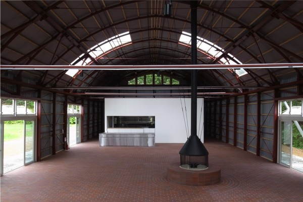 同スタジオは、築40年以上経過した牧草保管用倉庫を補強し、再利用したもの。外装材、内装材にはガルバリウム鋼板を二重に使用し、断熱材を挟むことで、熱環境を改善した。暖炉やキッチンカウンターなどの大勢で囲って使用する場を新たに設け、ディスカッションやワークショップに利用しやすい空間としている。