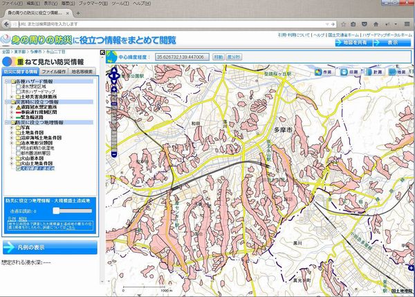 ハザードマップポータルサイトでの表示イメージ(赤い部分が大規模盛土造成地)