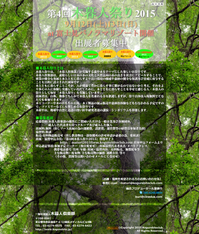 一般社団法人木暮人倶楽部(東京都中央区)は、9月12日~13日に長野県富士見町で「第4回木暮人祭り2015 」を開催する。 同法人の設立趣旨である木とともに人が暮らすことへのメッセージを様々な形で参加者が体験できるイベント。