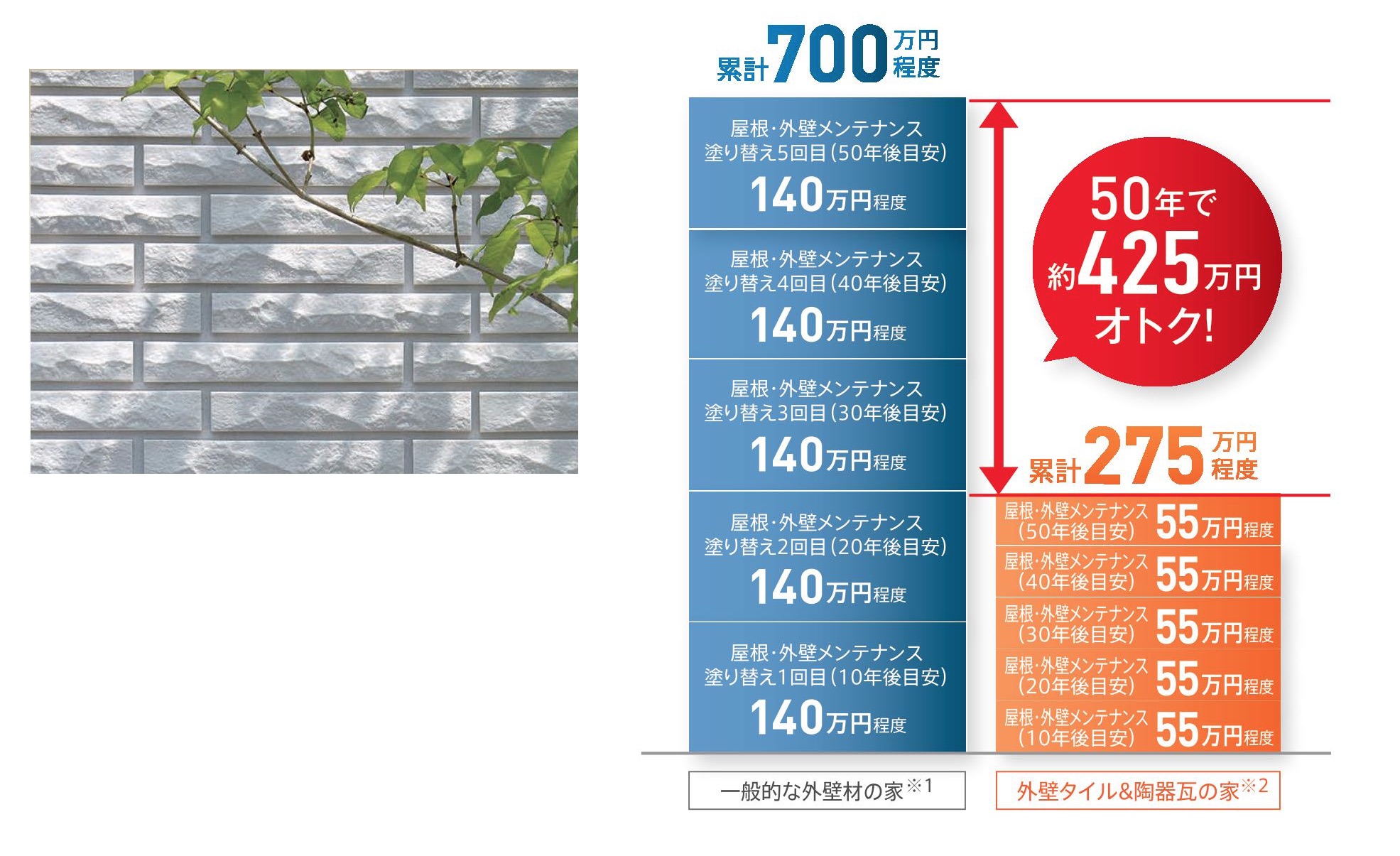 タイルの家は、12タイプ49色の多彩なデザイン、汚れがつきにくいセルフクリーニング機能、一般的な外壁材の半分以下のメンテナンス費用——といった特徴がある。