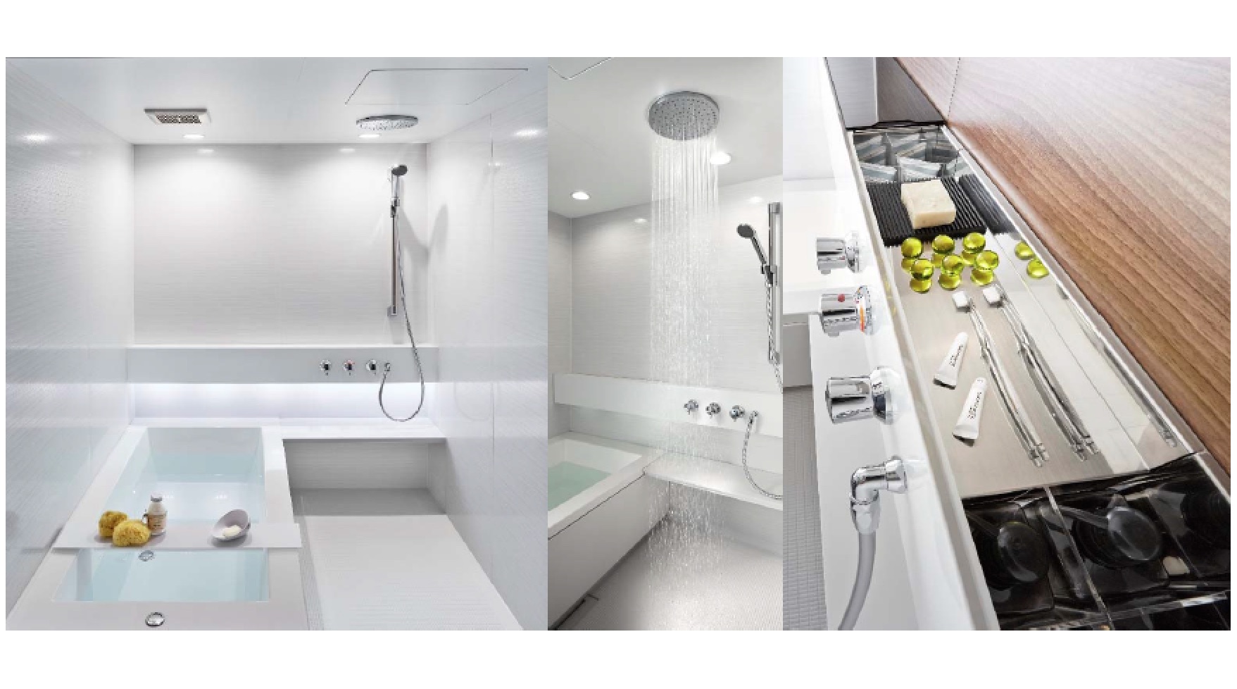 新シリーズでは、浴室におくモノの種類・量を分析し、それらすべてをしまって隠せる「マルチストレージカウンター」を採用。癒しのレインシャワーを標準搭載する。
