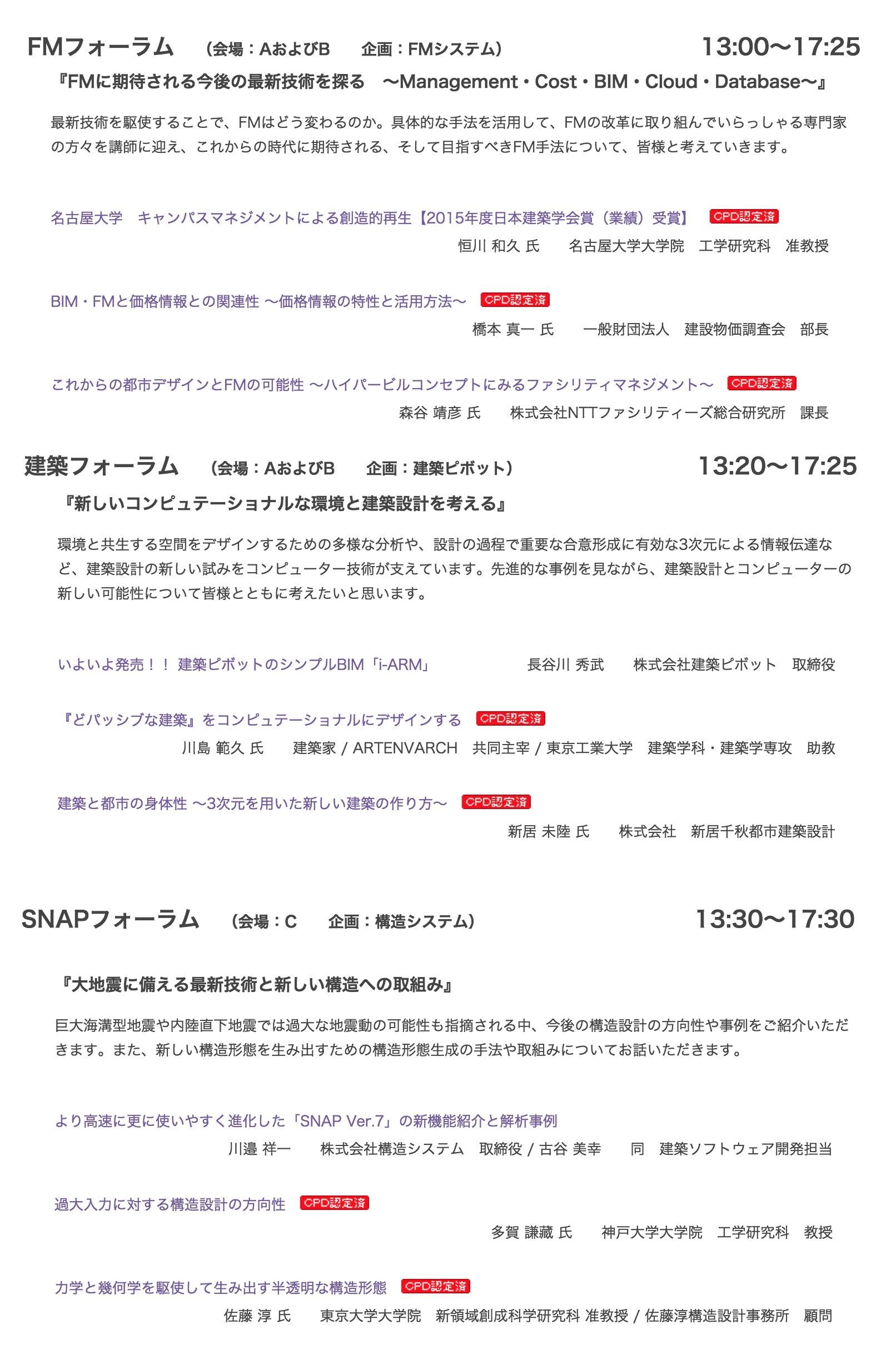 テーマは「建築の最新技術とITによる新しい試み」。建築や施設管理(FM)などの各分野の専門家が計9本の講演を行う。