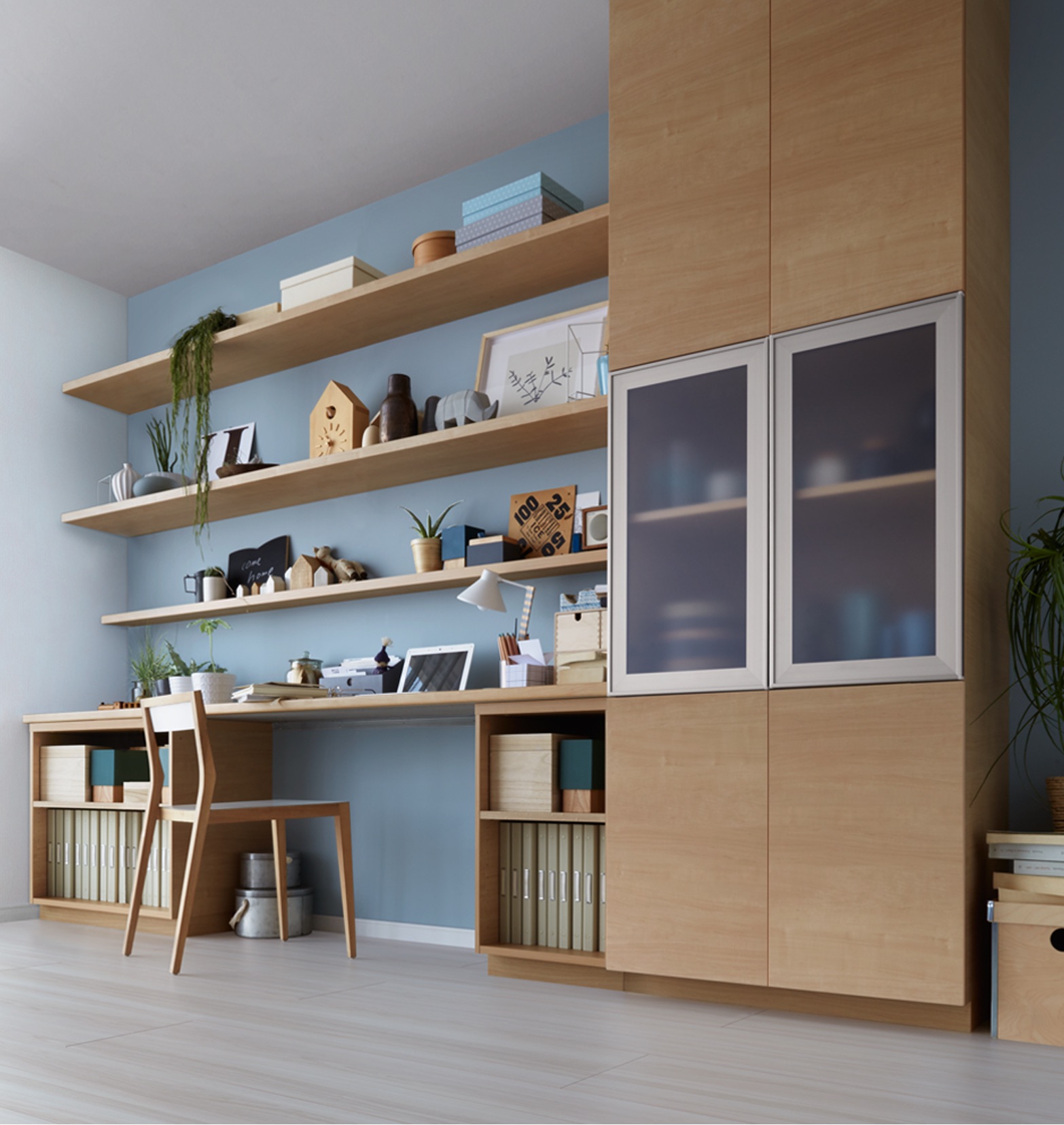 見せる収納は「一枚棚」、使う収納は「キャビネット」、しまう収納はキャビネット+扉・引き出しの「コアストレージ」と、ライフスタイルや習慣にあわせて選ぶことができる。