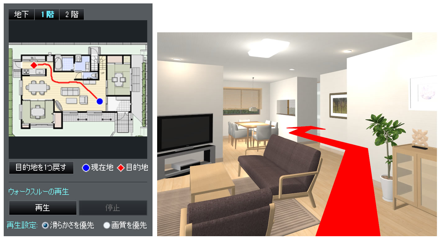 新しい自動ウォークスルー機能は、間取り図内の見たい場所を順番に指定すると人工知能が経路を自動生成して仮想空間内を動画で見て回ることができるもの。