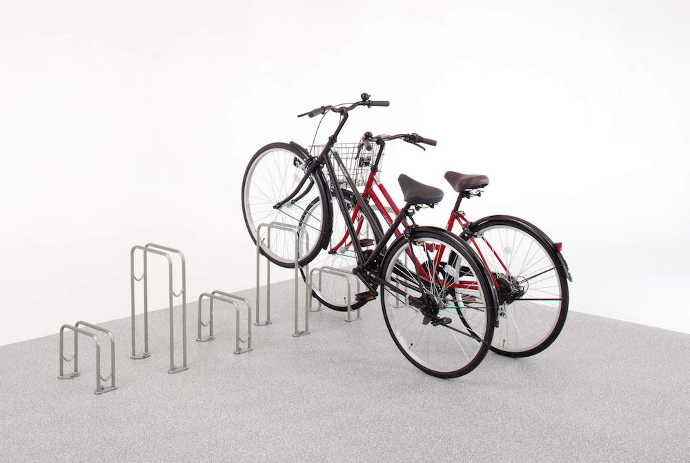 前輪を固定するタイプ。1台用で、スペースに応じて必要量を設置することができる。低位式・高位式の2種類。1万5500円〜2万1000円。