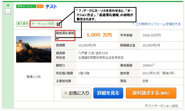 表示価格は最低落札価格(売主希望価格)とし、出品期間中に最も高値で入札した人が売主との契約交渉権を得ることができる。