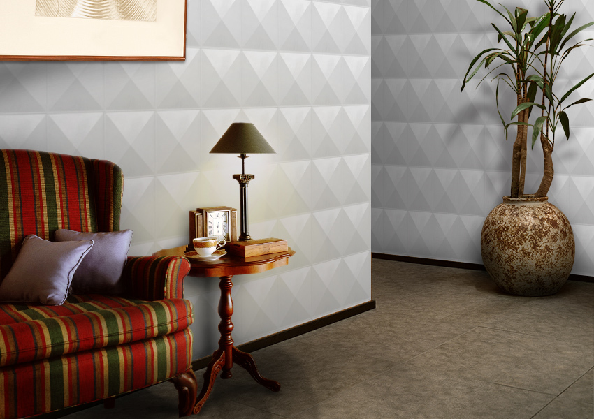これまでも、紙パルプ、古材を使った3Dボードが人気をあつめてきたが、今回はスチール素材をラインアップ。照明をあてると陰影が際立つドラマチックな演出効果が期待できる。