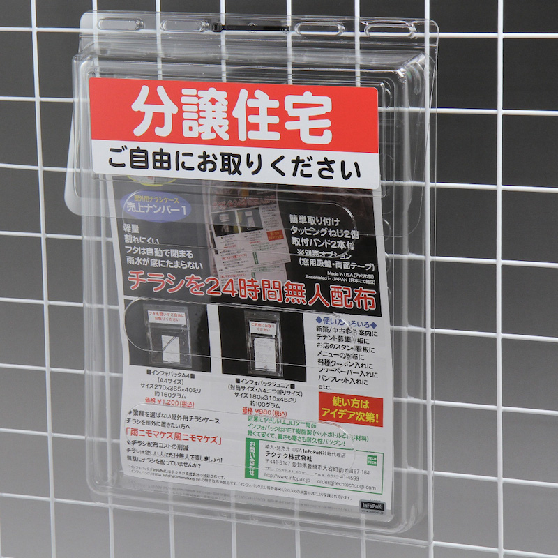 テクテク(愛知県豊橋市)はこのほど、屋外対応のチラシケース「インフォパックA4不動産・建築業用ステッカーセット」を発売した。