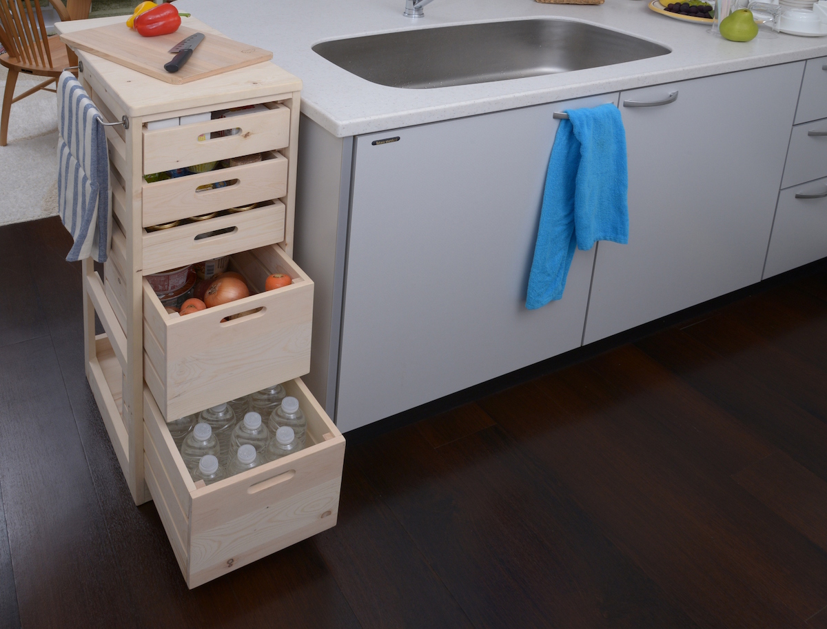 調味料からペットボトルまで様々な形状のモノを収納できるよう、引き出しに浅型を追加。天板は40cmから60cmまで広がるバタフライテーブルとし、キッチンカウンターと合わせて作業台として使える高さ(90cm)に設定した。