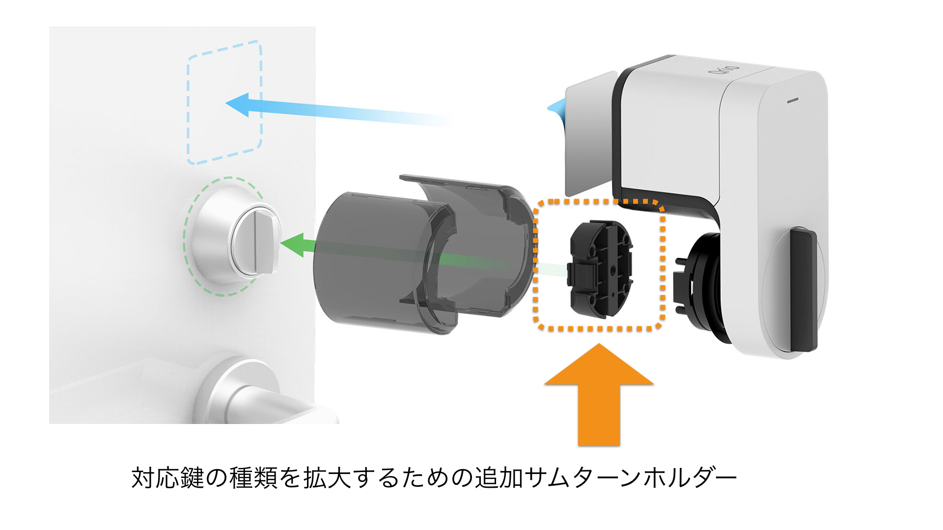 Qrio(東京都港区)は3月、スマートフォンでカギの開閉ができる「キュリオスマートロック」の対応カギを拡大するため、新たにサムターンの形状にあわせて設置するアタッチメント(サムターンホルダー)を発売する。