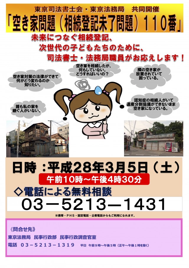 東京司法書士会(東京都新宿区)は3月5日、東京法務局と共同で「空き家問題(相続登記未了問題)110番」無料電話相談会を開催する。