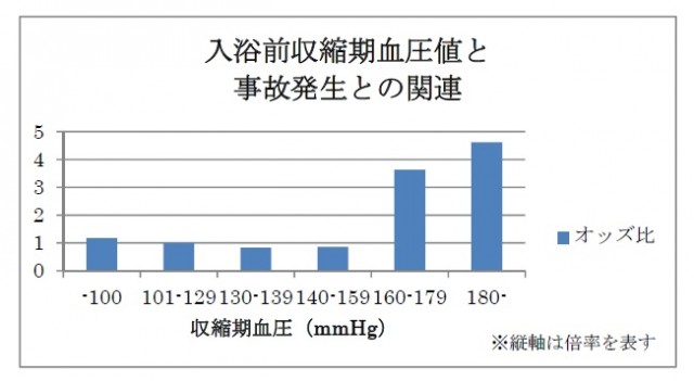 それによると、入浴事故の発生と血圧値の関連は、入浴前の収縮期血圧が160mmHg以上である場合、101〜129mmHgを基準とした場合に比べて3.63倍。入浴前の拡張期血圧が100mmHg以上である場合は、61〜84mmHgを基準とした場合に比べて14.71倍となり、高血圧時の入浴は事故発生のリスクが高いことが明らかになった。