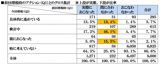 これらのデータをクロス集計したところ、前回「おこなった」と答えた人のうち、今回も「具体的に進めている」という人は13.5%。前回「間に合わなかった」と答えた人のうち、今回「既におこなった」という人は15.5%、「考えている」という人は46.1%となり、前回増税時に「間に合わなかった」人が、早めの対策を心がけていることが分かった。
