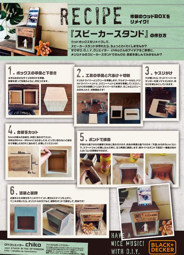 「D.I.Y.レシピ」では、chikoさん、gamiさん、milyさんという3人のDIYブロガー(*2)が市販の木箱や木製トレイをリメイクして「スピーカースタンド」や「収納ボックス」をつくる方法・コツを写真とともにわかりやすく伝授する。