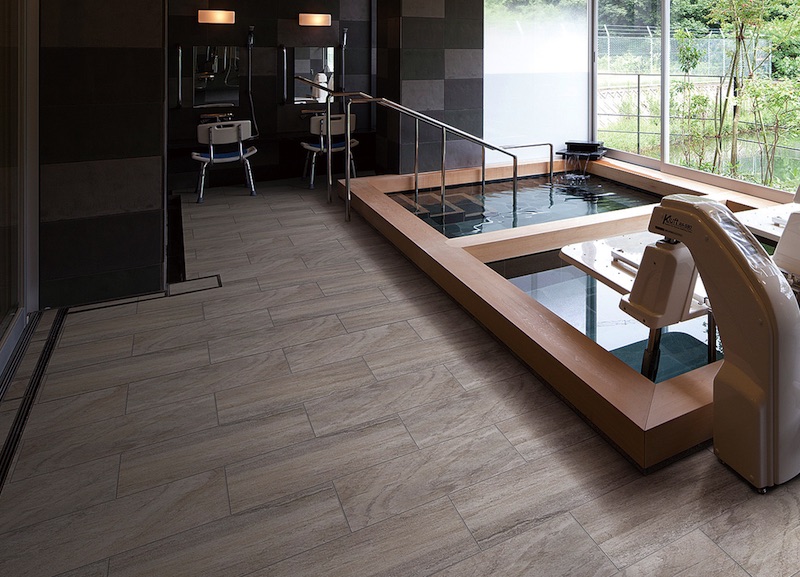 「サーモタイル」は、表層部に断熱・抗菌・防滑性能をもたせ、高度なデジタルプリント技術による3デザインを加えた。大判(600x300角)でリアルなスレート調の「グランリベルタ」、大理石をモチーフにした「プレージョ」などをそろえた。介護施設の大浴場などに。