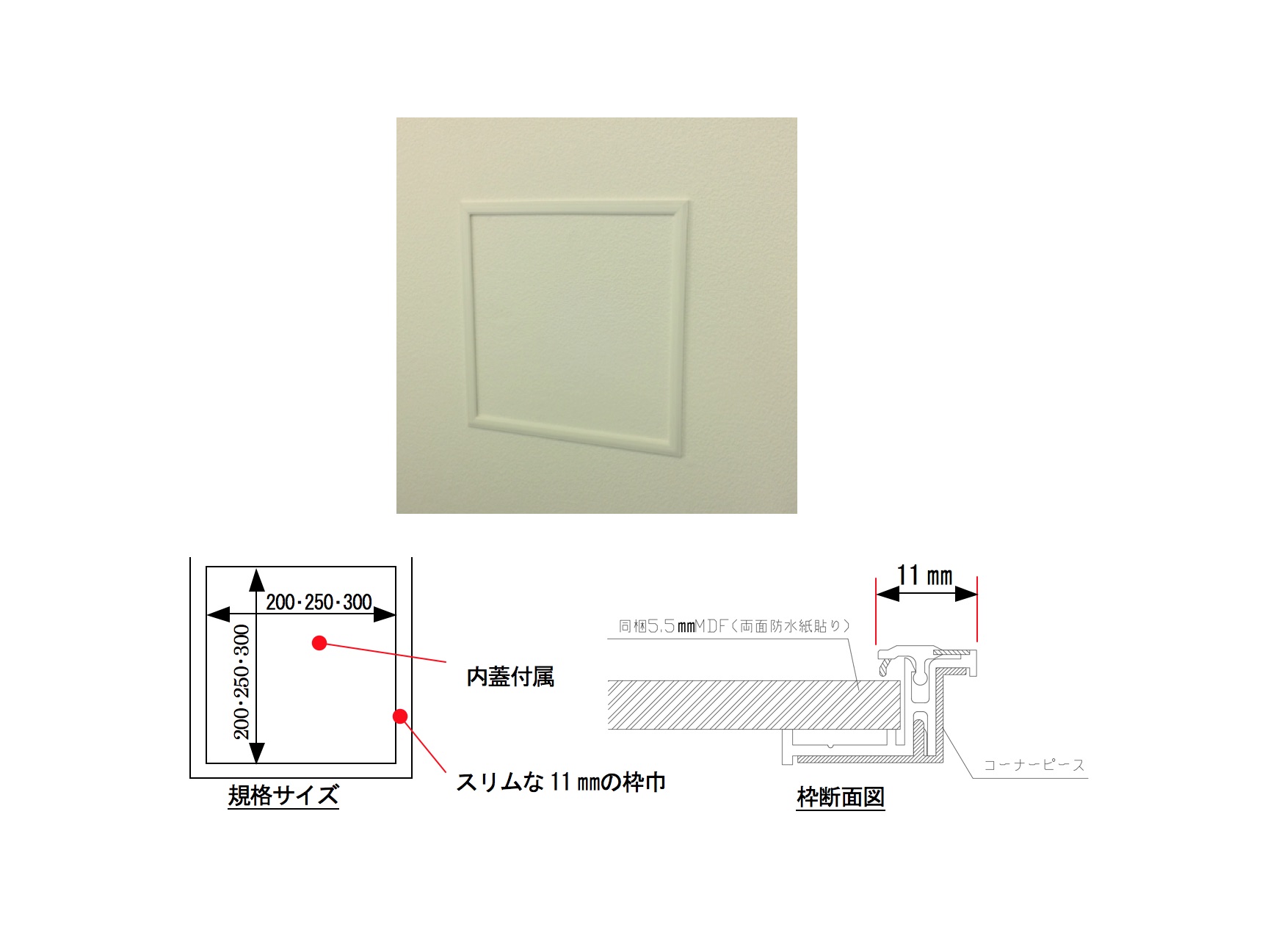 PVC樹脂製で、枠の見付巾を11mmにおさえたスッキリとしたデザイン。内蓋を付属することで、これまで現場で別途必要だった内蓋作製の手間を削減する。