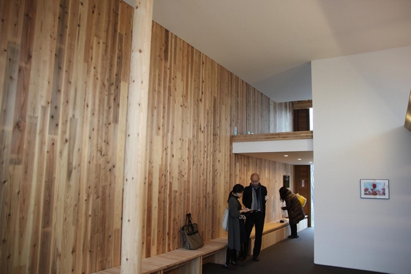 CLT実験棟はCLTパネル工法2階建て延べ166m2。今年はその施工性、居住性、耐久性などについて基礎的なデータを得る。特徴は高さ6mの壁パネルなどをCLT構造材で「現し」に仕上げたデザイン。また、保有水平耐力計算を行いオーバーハングなど構造上のチャレンジをしている点など。問い合わせや見学希望は日本CLT協会まで。