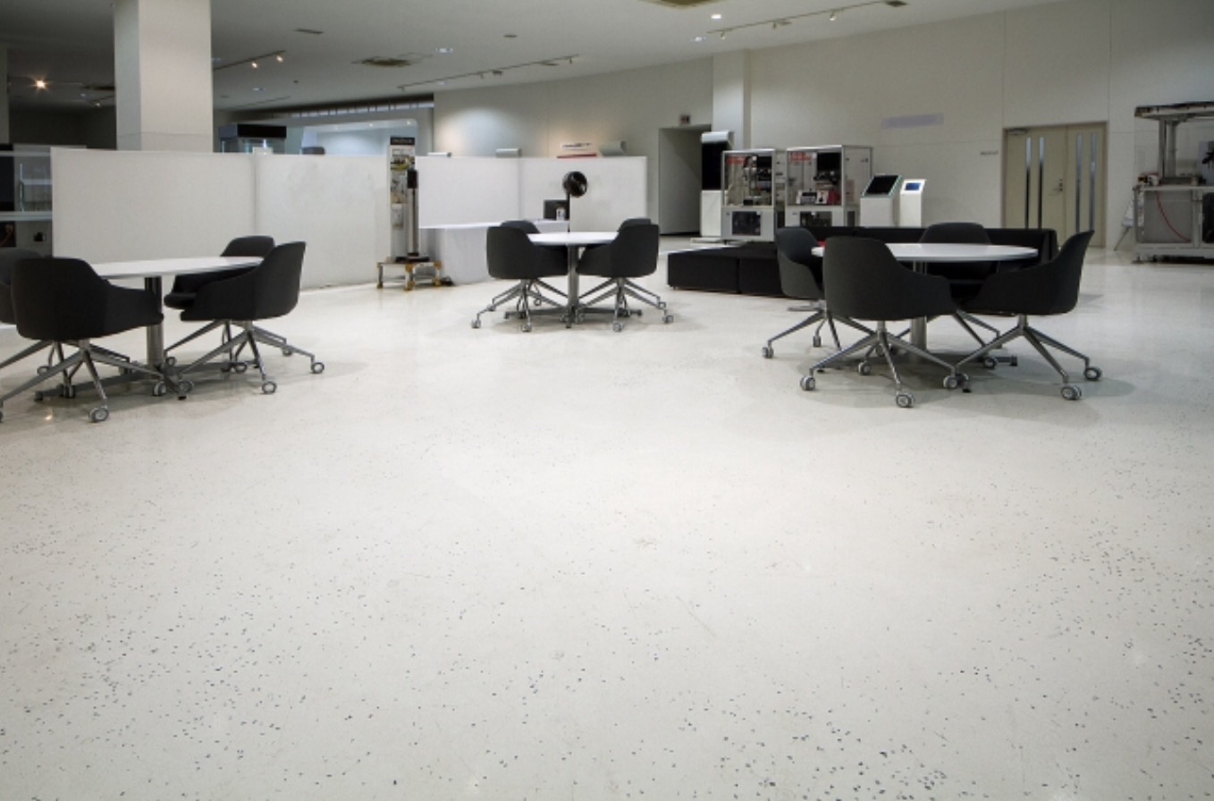 研ぎ出し床は通常、研磨工程までに数日間の養生が必要だが、新商品は速硬性をもたせることで大幅な工期短縮を実現。主材施工の翌日には研磨作業に取りかかることができる。