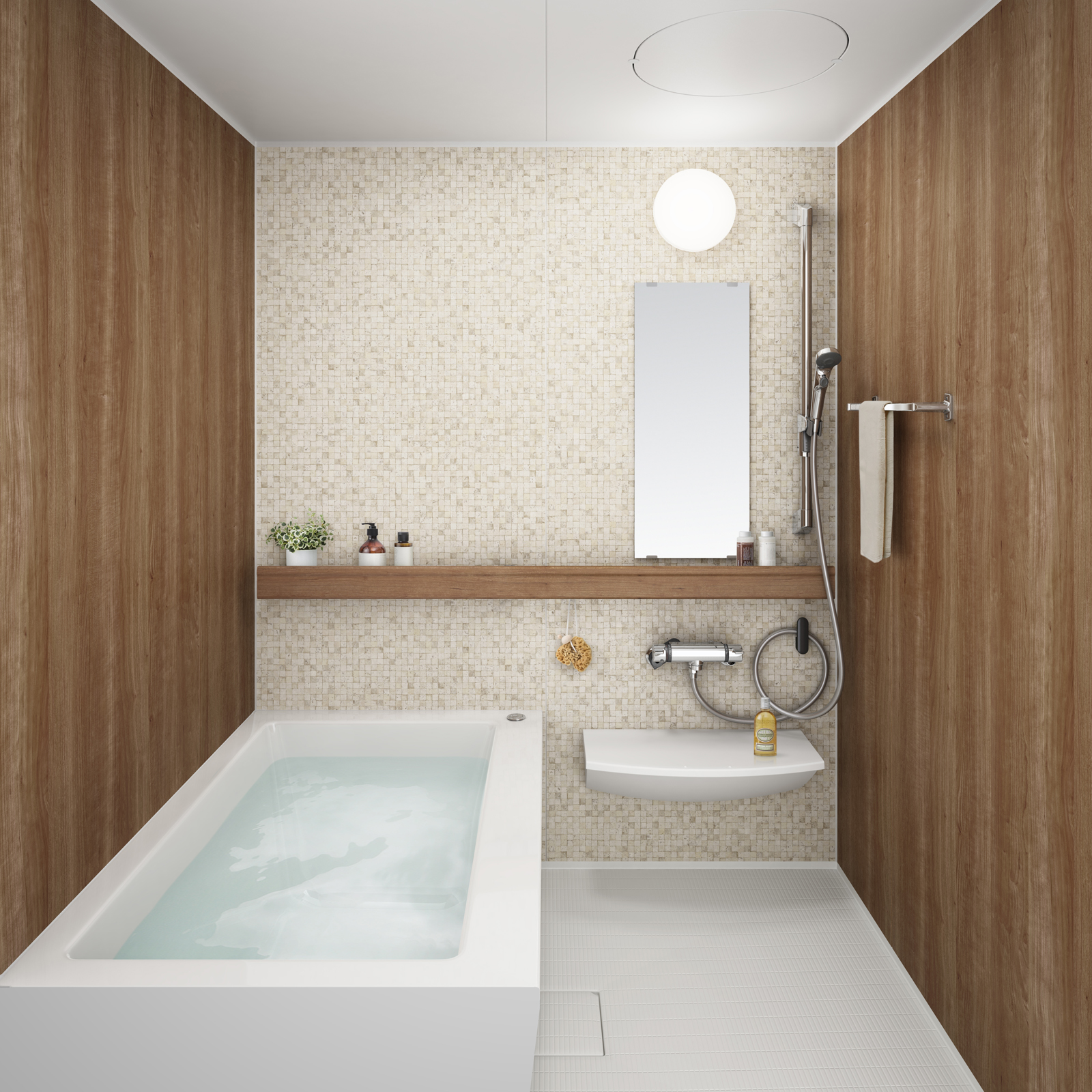 戸建て用で好評の「おきラク手すり」を標準搭載。浴室内の一連の動作をサポートするだけでなく、インテリア性と収納性にもすぐれる。