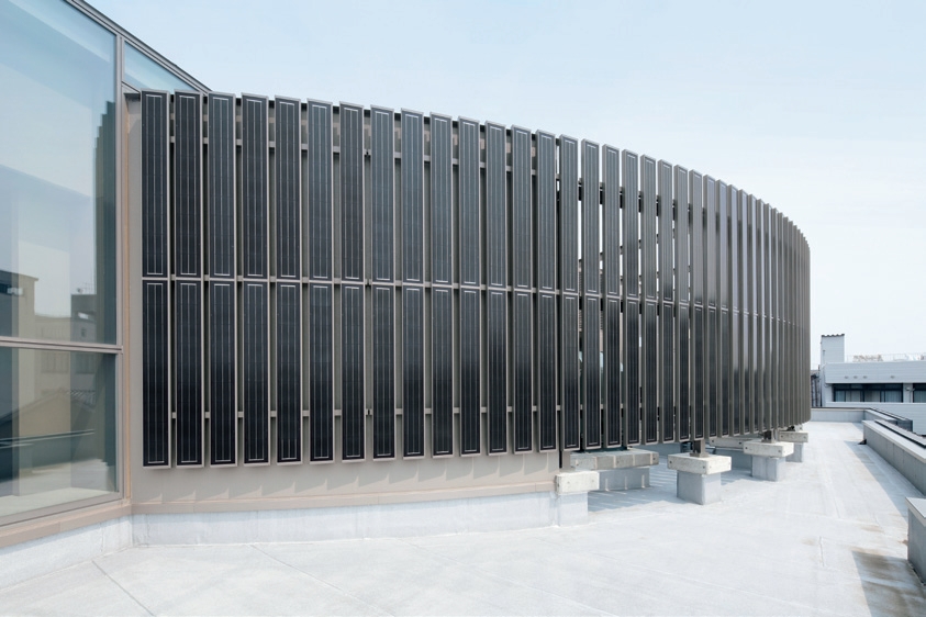 新商品の縦型タイプは、太陽電池パネルの角度が90度になるため、ゴミがたまりにくく、降雪地域にも適するのが特徴。屋上や階段室など多様な敷地形状に対応し、曲面にも設置することができる。