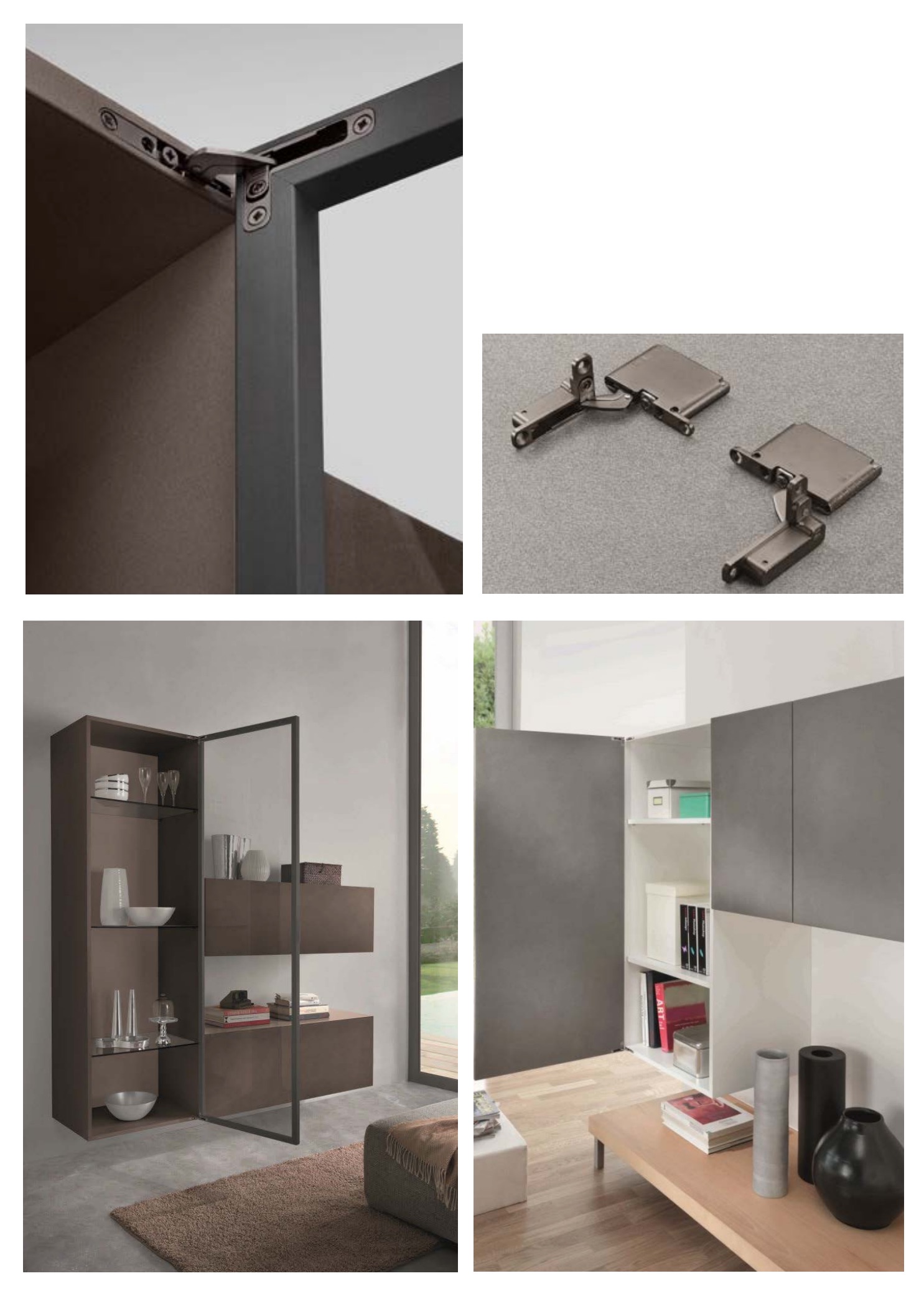 キャビネットの天板と底板に加工された下穴に埋め込んで設置できるため、ヒンジの存在感を最小限に抑えることができる。扉がゆっくりと閉まるソフトクローズ機能を内蔵した。キッチン、リビング、寝室の家具に。