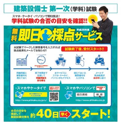 ホームページの「解答入力フォーム」に必要事項を入力して送信すれば、採点結果および合格ランク判定メールが当日中に届くというもので、試験終了直後から利用可能。正式な合格発表よりも約40日早く合否の目安がわかるため、第二次試験の製図試験対策をいち早くすすめることができる。