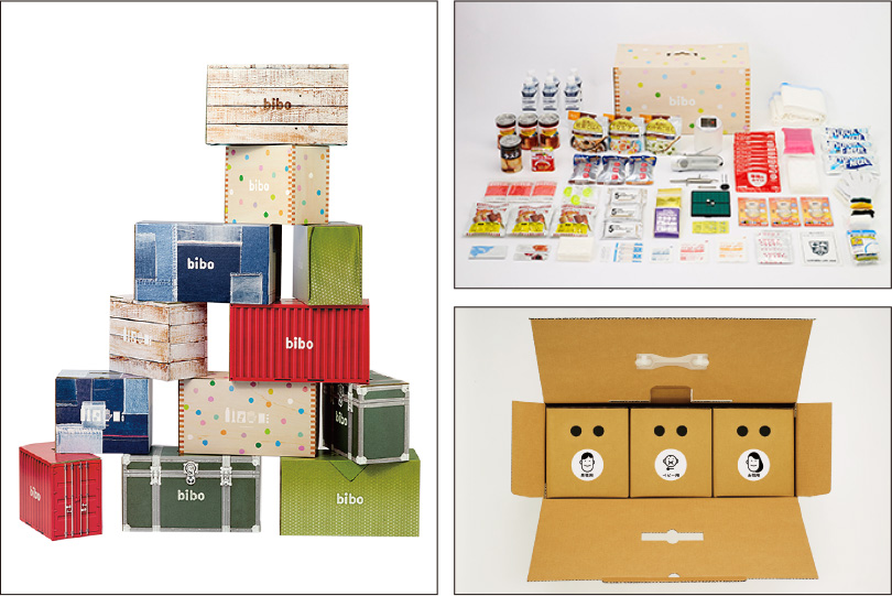 男性用、女性用、子供用、乳幼児用、高齢者用の5種類のユニット(小箱)があり、防災専門家がそれぞれに適した食糧や水、衛生・救急用品などをセレクト。家族構成に応じてこれらのユニットを2〜3個組み合わせ、段ボール製のボックスに収納して手が届く場所に飾る。