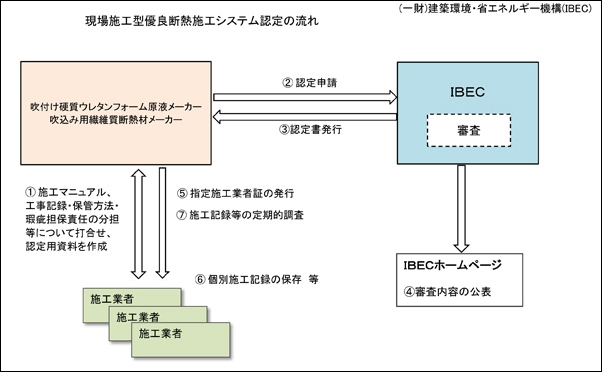 断熱材メーカー各社は施工業者に対して、施工マニュアルなどを周知したうえで指定施工業者証を発行。指定施工業者は個別工事の施工記録を保存し、メーカーが定期的に施工記録などのチェックを行うことで施工品質の確保を図る。その一連の仕組みをIBECが評価・認定する。
