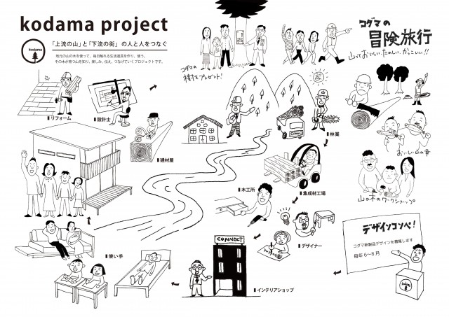 「コダマプロジェクト」は、木曽三川上流の岐阜県産材を使って、下流の名古屋にて生産販売を行うプロジェクト。これまで、愛知、岐阜の木曽三川の下流の各ショップで岐阜県産材を使った「コダマデスク」などを販売。「コダマデスク」を予約した親子には、岐阜の東白川山へのコダマの冒険旅行(1泊2日)に参加し、山や工場を見学して職人とともにパーツ製作する機会などを提供している。また、「生活道具」の新商品開発で学生を対象とした新商品コンペも展開している。