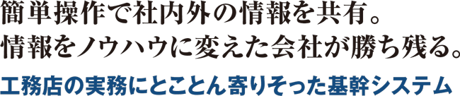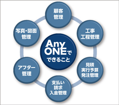 『 エニワン』で何ができるのか。ざっくりと言えば、新築・リフォーム事業に係るほぼすべての業務-顧客管理、工事管理、工程表、見積、実行予算、発注、支払い、請求、入金、アフターメンテナンス、写真、図面の一元管理が可能になる。社外で行う攻めの営業も、社内でやるべきデータ整備も、1つのシステムでまかなうことができる。