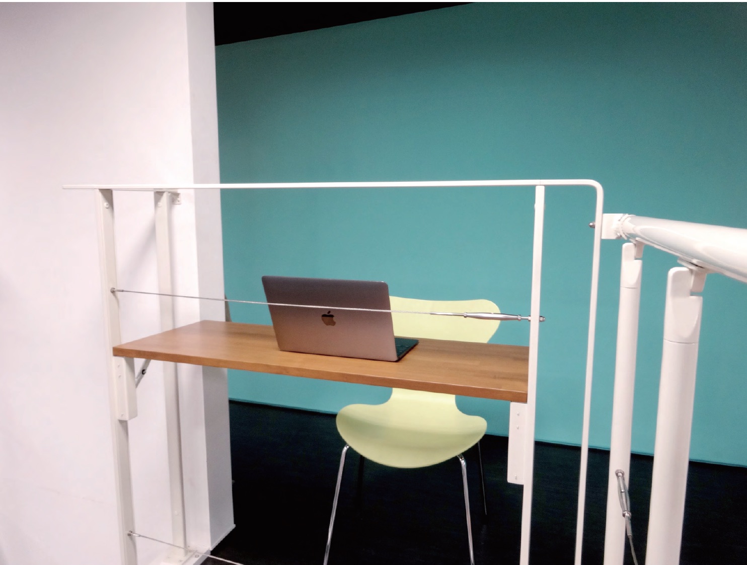 吹き抜けの手すり部に取り付けられる折りたたみ式のカウンターで、子どもの勉強机やおとなの読書机などとして利用できる。使わないときは収納可能。