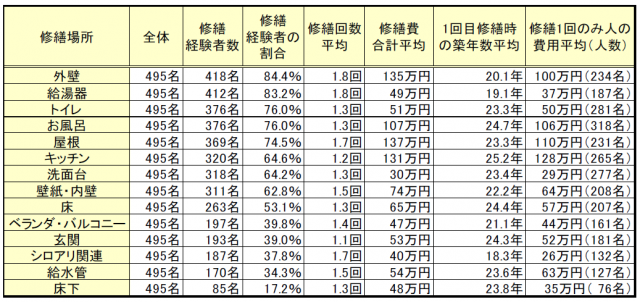また、自宅の各場所について、これまでに修繕を行った回数や修繕費の合計などを聞いたところ、修繕した割合が多かった場所は「外壁」(84.4%)、「給湯器」(83.2%)、「トイレ」(76.0%)、「お風呂」(同)が上位だった。1位の「外壁」を修繕した人の修繕回数は平均1.8回、修繕費の合計平均は135万円だった。修繕が1回の人だけに絞ると費用は平均100万円だった。