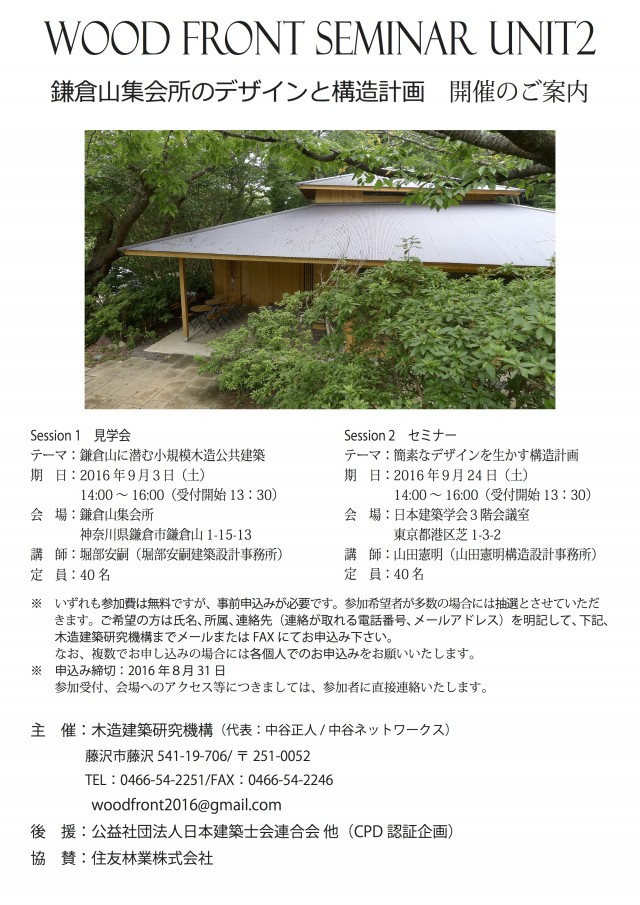 木造建築研究機構(中谷正人代表/中谷ネットワーク)は、今後需要が高まるとみられる小規模木造公共施設の計画手法を学ぼうと、堀部安嗣氏が設計を手掛けた「鎌倉山集会所」をテーマにした見学会・セミナーを開催する。