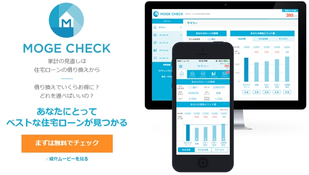 「モゲチェック」は、家計にインパクトのある住宅ローンを最もお得に借り換えるサポートを目的に、借入額や金利タイプの分析によって、借り換えメリット額に応じた住宅ローンランキングを作成し、ベストな住宅ローンの借り換え先を提案するサービス。