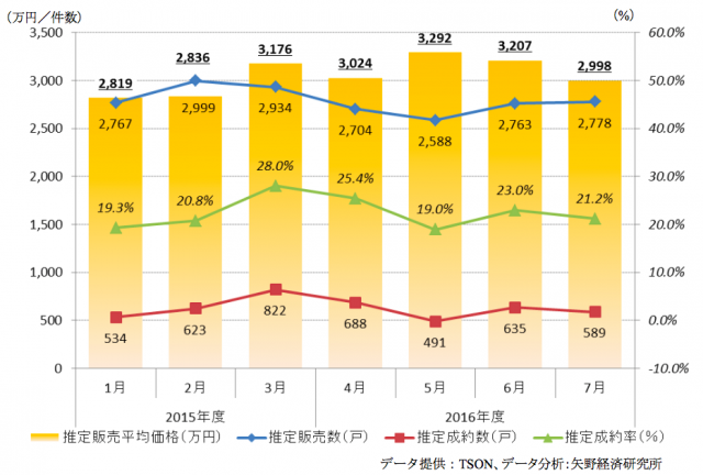 買取再販型中古マンションの平均推定成約価格は、2015年度第4四半期が約2970万円/戸、2016年度第1四半期が約3160万円/戸となった。