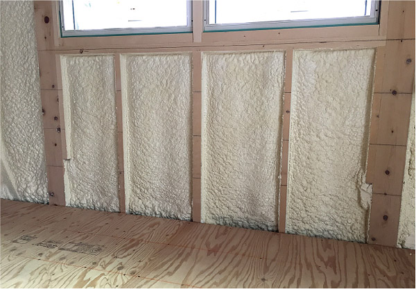 原料の2液を吹き付けて独立気泡を形成し、断熱・気密施工を同時に完了。透湿抵抗を高めたことにより、室内側の防湿層が不要になり、設計の自由度が上がった高性能タイプのノンフロン化実現