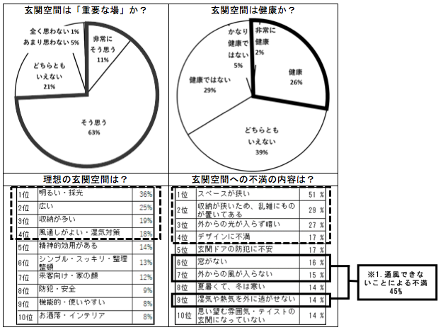 現状の玄関空間への不満を聞いた質問では、「狭さ(スペース・収納)」と「暗さ(外光が入らない)」が上位を占めた。また、「外からの風が入らない」「湿気や熱気を外に逃がせない」「結露が不満」「カビが出るのが不快」「窓がない」など、「風通しが悪い」ことが原因となる不満も目立った。