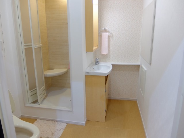 「クレイドルキャビン」は、十分にくつろげる広さの寝室タイプのほか、男女別々のトイレ・シャワーを完備したタイプを用意。写真(下)は、女性用のトイレ・シャワー室。