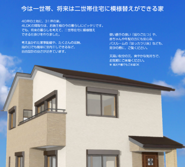 川木建設(埼玉県川越市)は、「今は一世帯、将来は二世帯住宅に模様替えができる家」の完成見学会を、11月12日、13日の2日間、川越市松江町にて開催する。