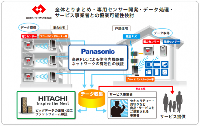 同試験では、家電製品の種類ごとの電気使用の変化をリアルタイムに検知する電力センサーと、住宅内の温度などを測定する環境センサーを分電盤周辺等に設置し、センターシステムでデータ収集、日立製作所の専用システムで蓄積・加工するプラットフォームを構築する。