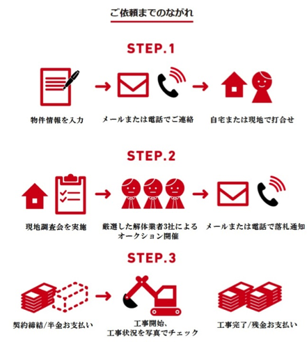 同サービスでは、信頼できる解体業者間で行われる解体工事費のオークションで最安値の業者に解体を発注できる。解体後に土地を売却する場合は、買取業者間のオークションを開催して、高値かつ早期の土地売却が可能となる。参加する解体業者は、実績を考慮し、許認可状況、マニフェスト・保険加入など基準をクリアできる会社を選抜する。