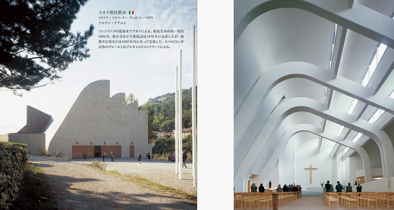 建築家・アアルトによるイタリアの「リオラ教区教会」、10世紀末に完成したスペイン・コルドバの「メスキータ」、スイス・スンヴィッツにあるこけら葺き外壁の「聖ベネディクト教会」など。