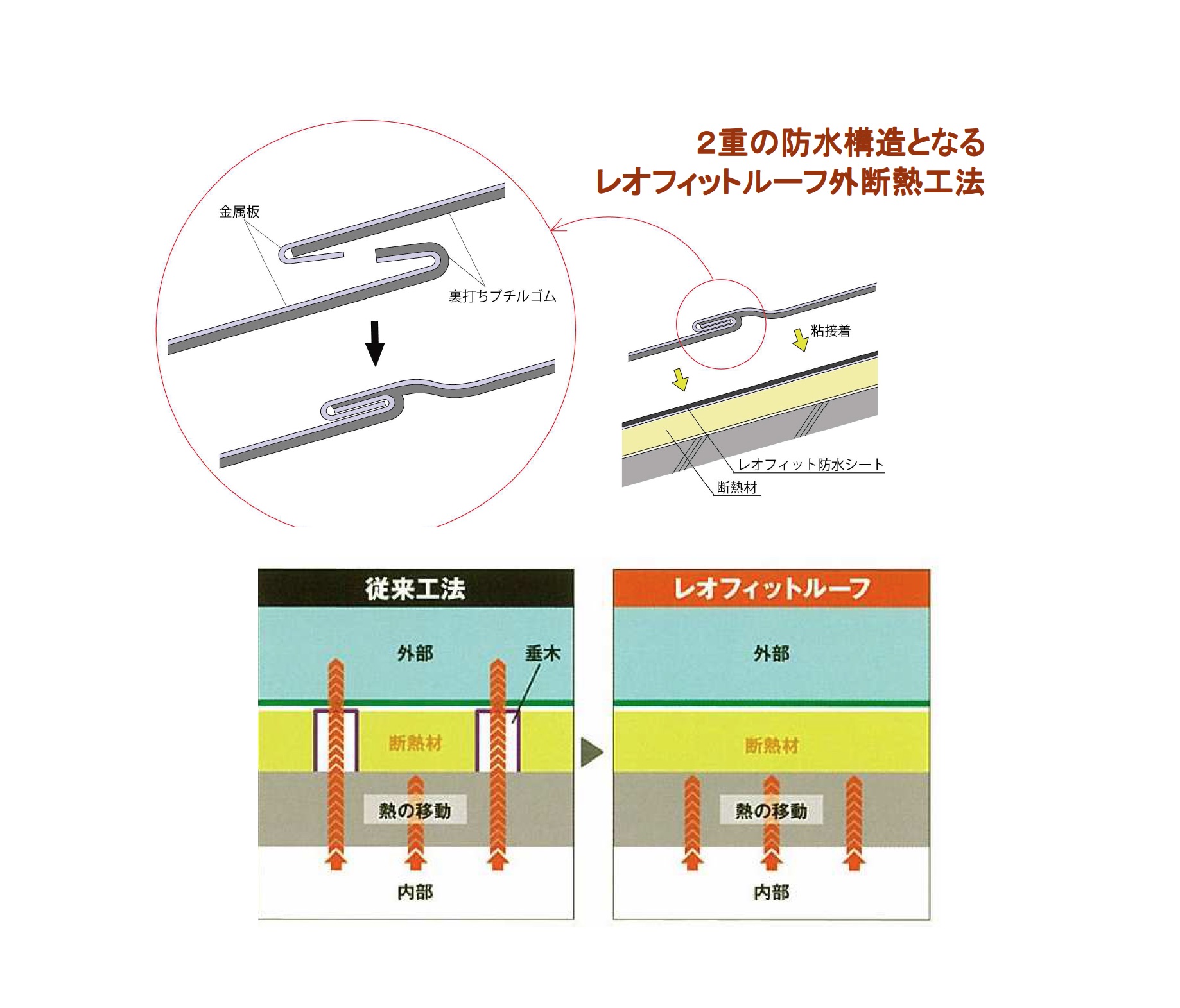 また、曲面への追従性が高く、曲面・緩勾配屋根に適する。ガルバリウム鋼板、銅板、ステンレスなどさまざまな金属屋根に対応する。