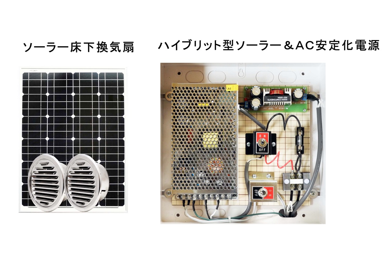 乾燥期には単結晶50Wのソーラーパネルで発電した電力で、梅雨などの高湿度期には商用電源に切り替えてファンを連続運転する床下換気扇。最大風量は約150m3/h。 ユニット本体価格は9万1800円。