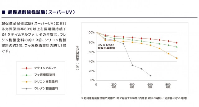 耐候性、フレキシブル性、低汚染性、塗着性、難燃性、防藻・防カビ性にすぐれ、雨水が汚れを洗い流すハイドロクリーニング機能をもつ。期待耐用年数は20年超。