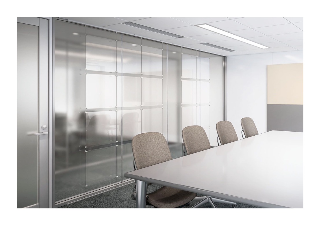 厚2x482x482mm。専用アルミレールを天井・床に固定し、その間にワイヤーを張ってパネルを設置する。