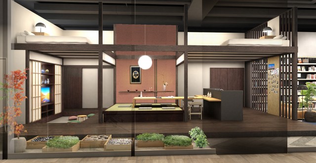 「さあ、民泊リフォーム!」では、コミュニケーションスペースとしてのLDKを再現。国際交流や地域貢献、またシェアリングエコノミーの先駆事例として注目される「民泊」サービスのためのリフォーム提案で、和風家屋の良さを生かしながら、外国人が日本文化に親しめる空間になっている。