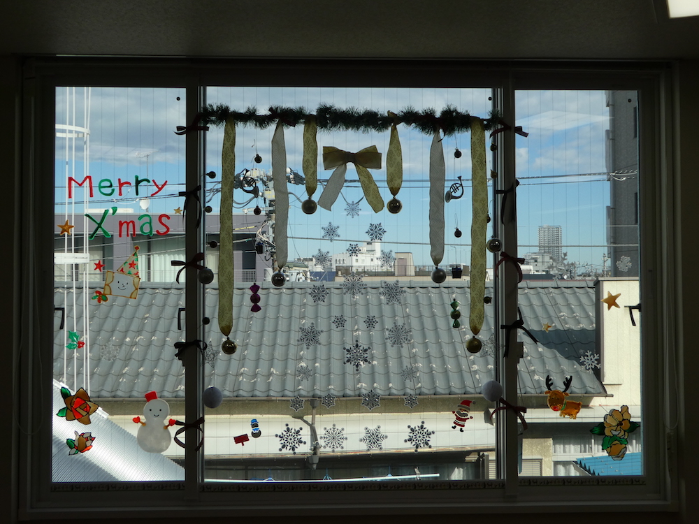 マテックスのスタッフがオフィスの窓1面をクリスマスをイメージして即席で「デコ窓」。東急ハンズや100均で手に入るもので簡単にデコレーションすることができるという。